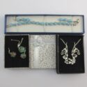 ![]() (LOT: P230) | ![]() Three sets of brand new jewelry in original boxes. The green necklace and earring set is glass with gold inclusions that look very much like little Murano paperweights. The silver set is marked SAQ on the necklace. All earrings are pierced and the blue rhinestone bracelet has an extendable clasp. All good quality. (Click Here to see full auction listing) Bidding opens on January 12, 2026 12:00:00 AM | |