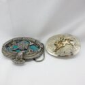 ![]() (LOT: P173) | ![]() Two Vintage Belt buckles. One with a design that includes an Eagle outlined between crossed tomahawks and the text above buckle with “Great Spirit Guide Me Today”. And a large eagle with open wings below. Marked Made in U.S.A. © 1999 GAP 4000 and other unreadable text. Made of thick metal with blue enamel or inlay details. Plus, another lighter metal, two-toned Western-style buckle featuring a brass or bronze raised bucking bull with cowboy rider. It is hand made and hand engraved. (Click Here to see full auction listing) Bidding opens on January 12, 2026 12:00:00 AM | |